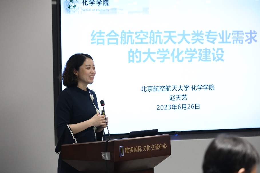 最后,北航化学学院院长助理赵天艺以“结合航空航天大类专业需求的大学化学建设”为主题展开报告。报告就北航化学学院所开设的大学化学课程基本情况、师资力量、建设成果等内容总体介绍了该课程建设现状,并结合空天特色,针对不同学生专业背景,提出“因材施教”的大学化学课程建设目标。同时,也对大学化学课程建设中面临的如何在有限学时内结合各专业所需,有效发挥化学基础学科的作用等问题,提出了大学化学课程建设的改革思路和举措。