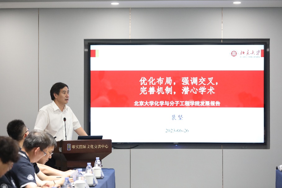 首先,北京大学化学与分子工程学院党委书记、国家教学名师裴坚教授进行“优化布局强调交叉完善机制潜心学术”主题报告。裴坚教授首先对北航化学学院十五周年表示祝贺。秉持“核心下沉,两翼张开,布局AI化学、新化工”发展理念,北京大学化学与分子工程学院对人才制度不断进行创新改革,坚持基础学科贯通式人才培养目标,营造浓厚学术氛围,增强产学结合。