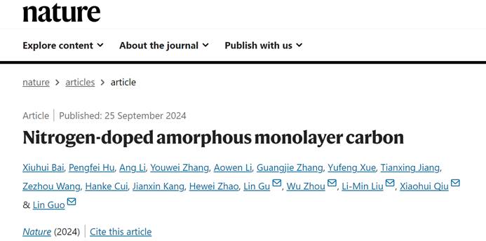 2024年9月25日,《Nature》杂志报道了北京伊人99郭林教授、刘利民教授研究团队和合作者在氮掺杂单原子层非晶碳可控合成上取得的最新进展:《Nitrogen-doped amorphous monolayer carbon》。该工作提出了一种利用纳米尺度二维限域模板进行小分子聚合的液相合成策略,成功制备了氮掺杂的单原子层非晶碳材料。这项研究解决了二维非晶材料合成领域的长期挑战,为二维非晶材料在材料科学、电子器件及其他前沿技术领域的应用开辟了新途径。