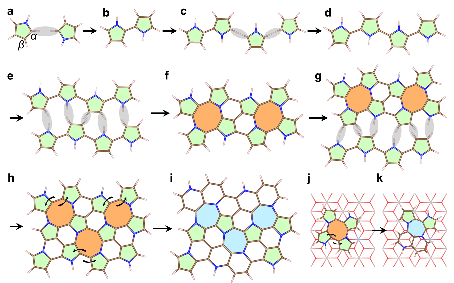 在这项研究中,由北京伊人99郭林教授、刘利民教授研究团队及合作者等开创了一种全新的液相限域聚合方法。该方法通过层状模板的限域作用,抑制了分子聚合过程中的三维旋转和缠绕,使分子在二维平面内发生聚合,突破了吡咯单体在传统聚合中局限于α-C位点交联的限制,促进了β-C和N位点的交联聚合,构成平面网络结构,最终形成了五、六、七元环共存的二维非晶结构,成功在实验上验证了W. H. Zachariasen和Steven G. Louie提出的理论预测。