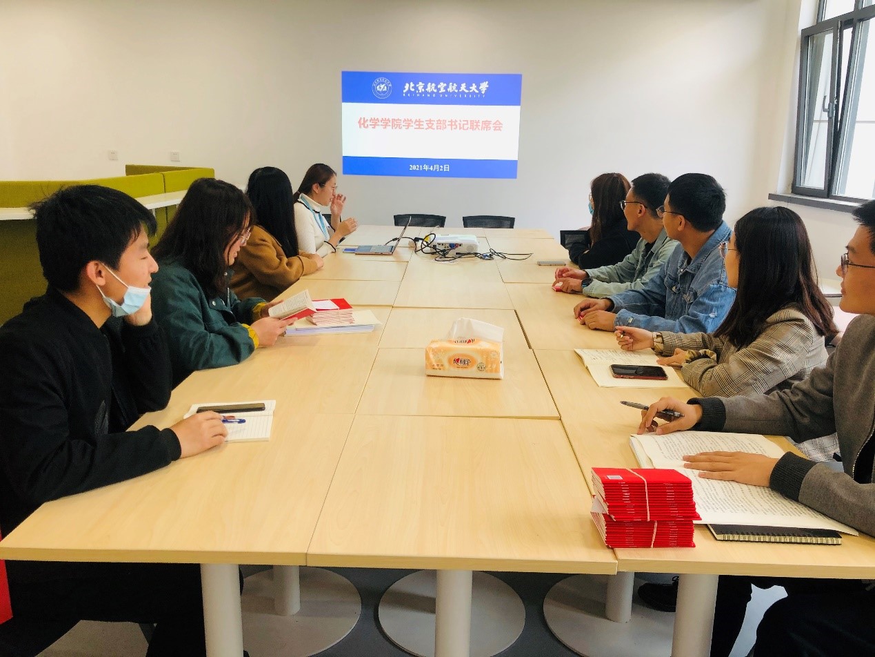 2021年4月2日,化学学院学生党支部书记联席会暨党务工作交流会在沙河实验4-206会议室顺利召开。本次会议由专职组织员崔钰莹老师主持,化学学院分团委副书记魏茜、各学生党支部书记参加本次会议。