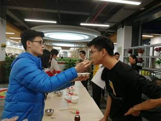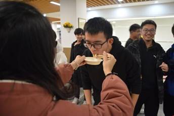在第一锅饺子出锅后,我们的第一个游戏便开始了。首先我们进行的是抢水瓶游戏,化学学院的导员黄澄玉和丁少松同学给大家做了一个示范,主持人说出一个身体的部位,两人分别摸自己的相应部位,在主持人说出“水”这个字的时候,两个人同时去抢桌子上的水瓶,但是黄导更快一步,于是作为输了游戏的人要被黄导喂五个饺子,场景太有爱了。之后同学们也积极加入到这个游戏中来,这也是一个很幸福的游戏了。